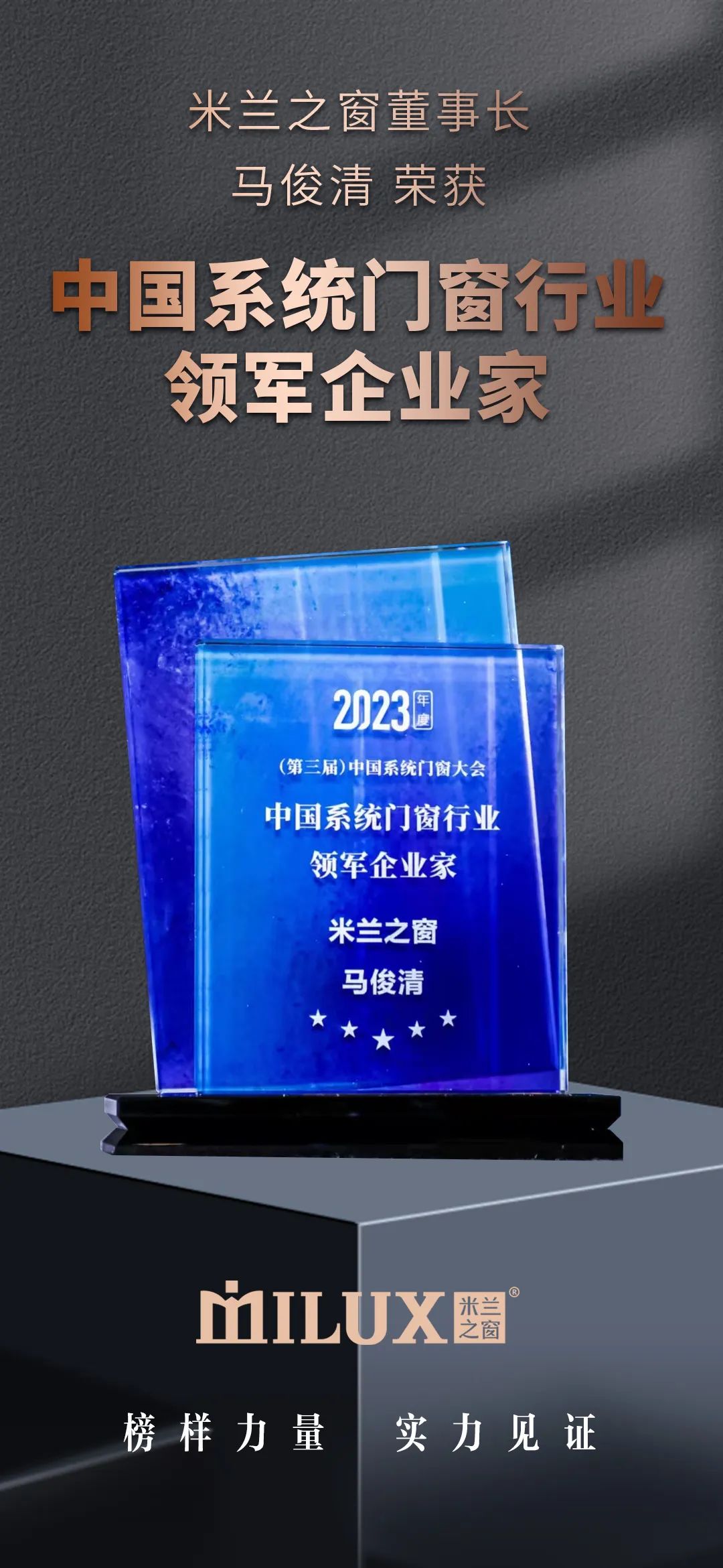 米蘭之窗憑借品牌力與創(chuàng)新力從眾多門窗品牌中脫穎勝出,接連斬獲“中國系統(tǒng)門窗行業(yè)最具加盟價(jià)值品牌獎”、“中國系統(tǒng)門窗行業(yè)品牌TOP30”兩項(xiàng)大獎,米蘭之窗董事長馬俊清榮獲“中國系統(tǒng)門窗行業(yè)領(lǐng)軍企業(yè)家”稱號。