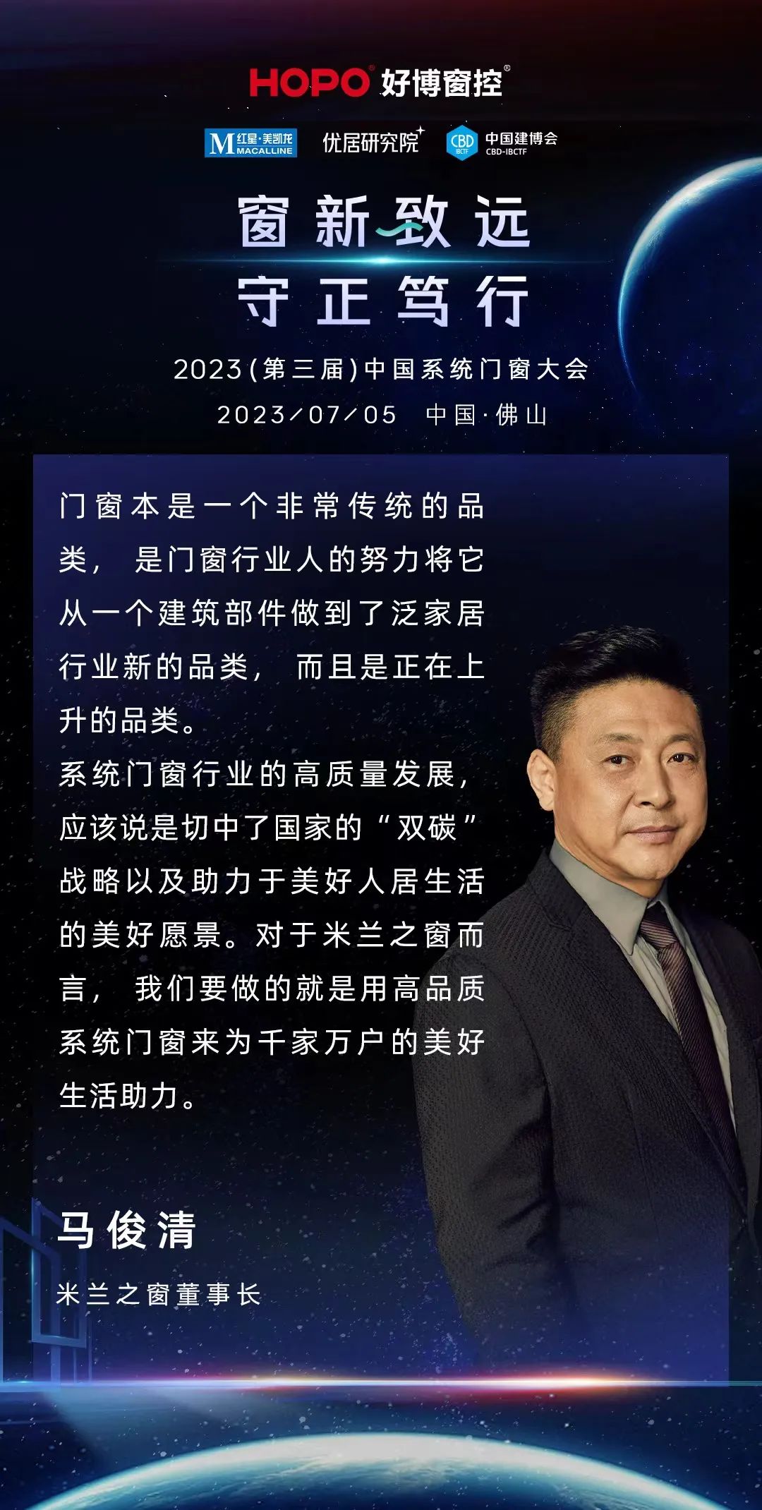 本次大會中,米蘭之窗董事長馬俊清代表門窗企業(yè)發(fā)表主題演講,演講從國家雙碳戰(zhàn)略的高度切入,鞭辟入里地分析了系統(tǒng)門窗行業(yè)的機(jī)遇與挑戰(zhàn)。面對亂象叢生的行業(yè),呼吁行業(yè)回歸初心,作為標(biāo)桿企業(yè),米蘭之窗的初心是堅(jiān)持可持續(xù)發(fā)展,建設(shè)綠色工廠,做綠色產(chǎn)品,為建筑節(jié)能減排做貢獻(xiàn),用高品質(zhì)系統(tǒng)門窗守護(hù)千家萬戶美好生活。